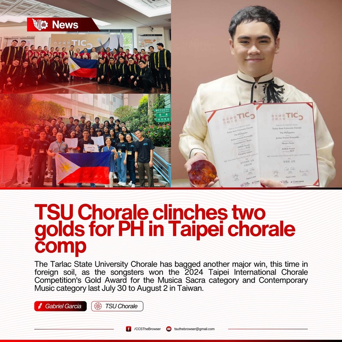 The Tarlac State University Chorale has bagged another major win, this time in foreign soil, as the songsters won the 2024 Taipei International Chorale Competition's Gold Award for the Musica Sacra category and Contemporary Music category last July 30 to August 2 in Taiwan.